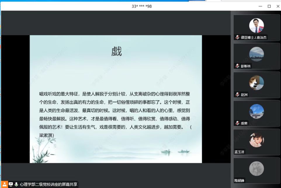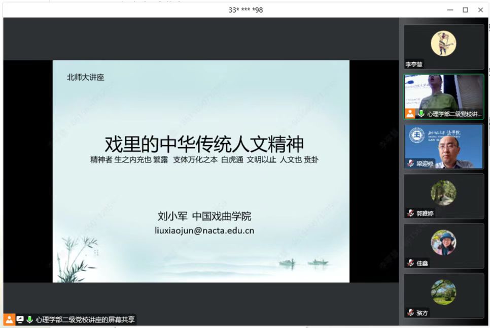 2023年5月10日下午,素人AV 党委和心理学部党联合举办二级党校讲座:《戏里的中华传统人文精神》。本次讲座由心理学部研究生第十三党支部承办,以线上线下结合的方式进行,主讲嘉宾为中国戏曲学院的刘小军教授,同时来自法学、心理、协同、环境、天文、核科学和数学学院的百余名同学师生党员和入党积极分子参加了本次讲座。
