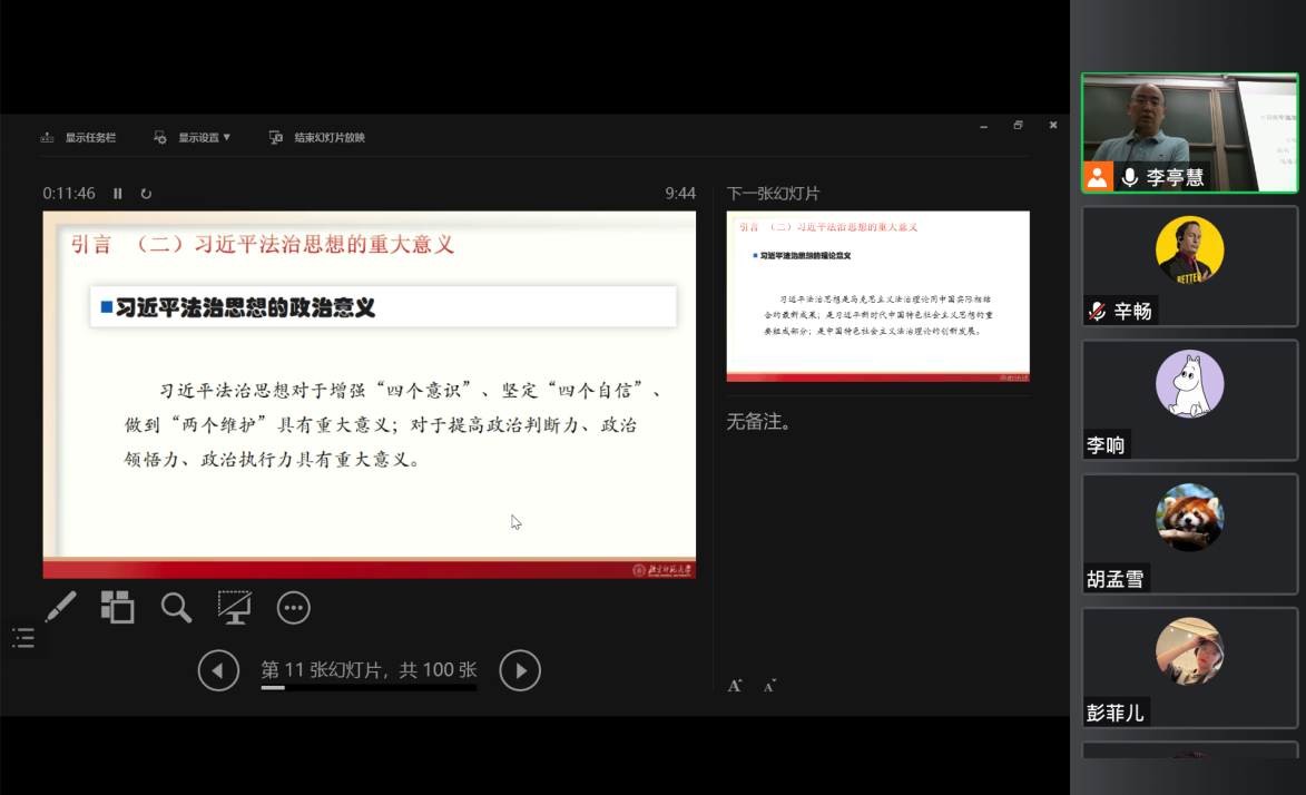 梁迎修教授就全面依法治国的重要地位、政治方向、工作布局、重点任务、重要保障、重大关系六个方面,分别从理论和实践层面进行了详细讲解。将习近平法治思想理论与现实中的例子相结合,对比以往执法、司法过程中存在的问题和如今执法、司法环节的进步,深刻阐明了习近平法治思想的重大意义。