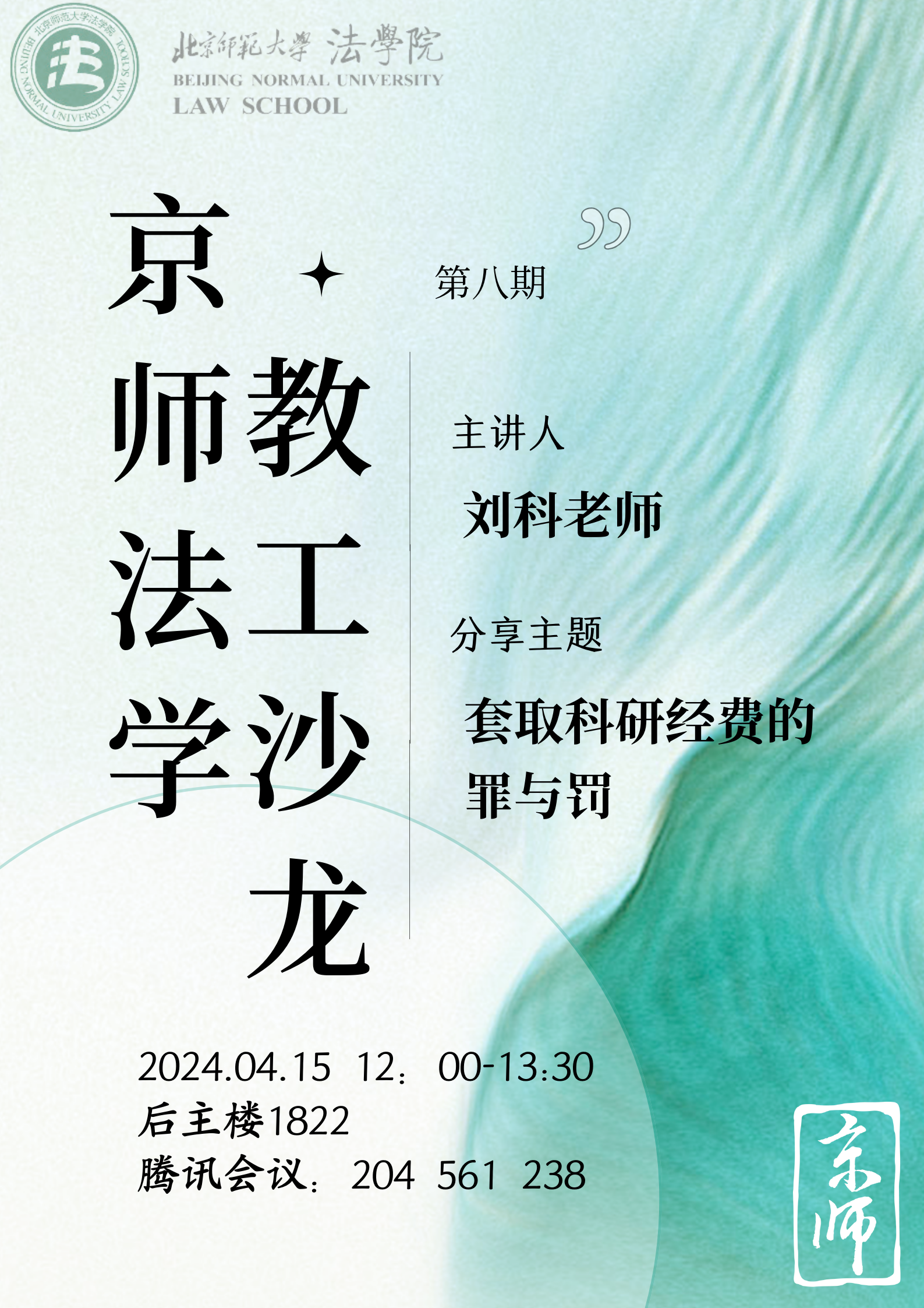4月15日,北师大素人AV 举行第八期“京师法学教工沙龙”,邀请刘科老师主讲《套取科研经费的罪与罚》,素人AV 工会主席严厚福副教授主持本次沙龙。本次沙龙向全校其他兄弟院系的老师们开放,素人AV 和其他兄弟院系四十余位老师通过线下或者线上的方式参与了此次沙龙。