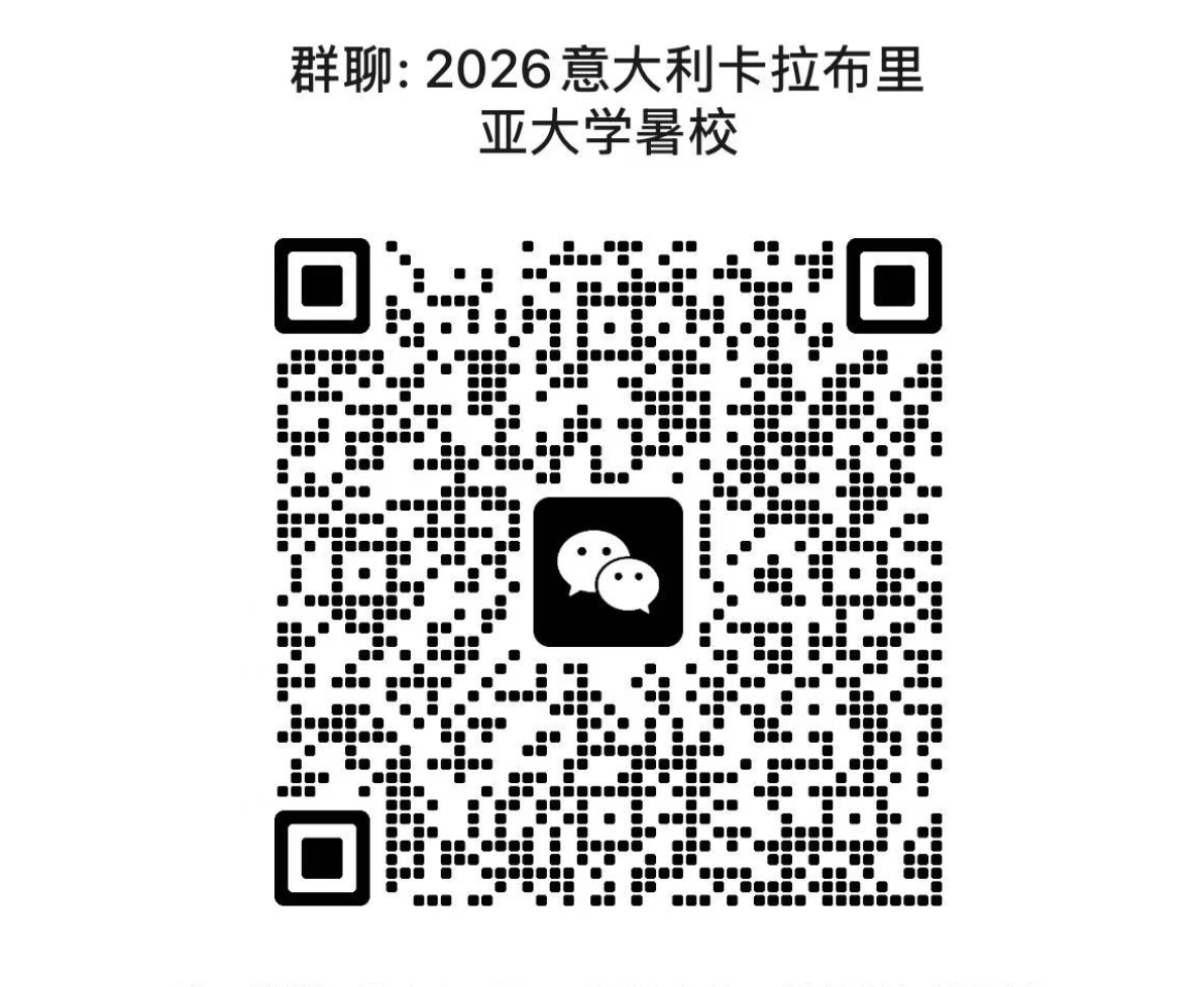 2.有意向报名的同学请于截止日期前下载并填写附件1,发送至邮箱:[email protected],邮件及附件主题请注明“2026年意大利卡拉布里亚大学暑期学校报名+申请者姓名”。同时扫码加入以下报名群。