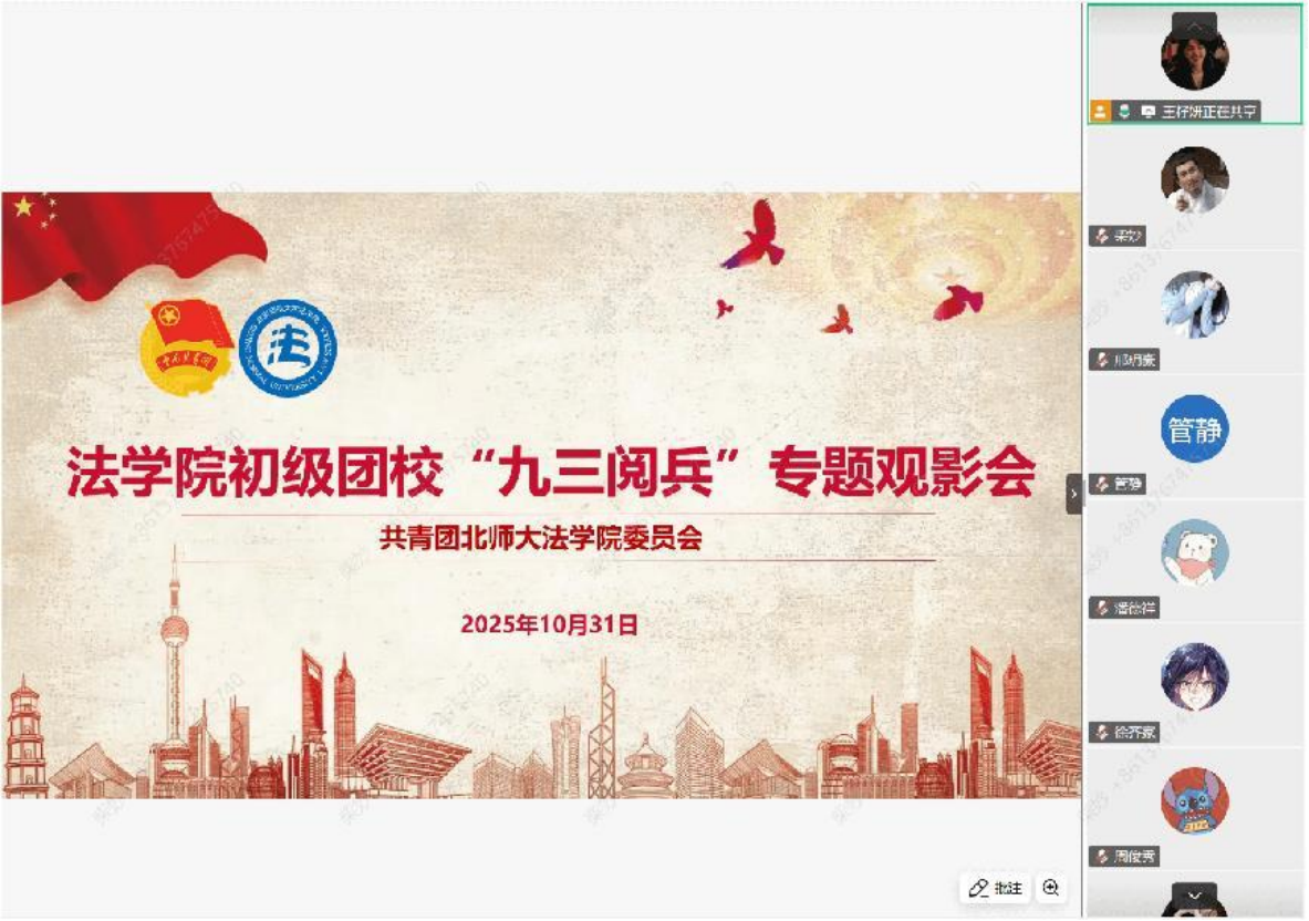 钢铁意志,再现历史印记;千万磨炼,飒沓盛世足音。为引导团校成员感悟纪律与忠诚的精神内核,学习追求卓越、团结协作的优良品质,从而坚定理想信念,将个人成长融入国家发展与民族复兴的伟大事业,10月31日,素人AV 团委理论研究部组织初级团校成员共同观看胜利日阅兵专题片《必胜》。在此次活动中,全体同学积极参与,深刻体悟,收获颇丰。