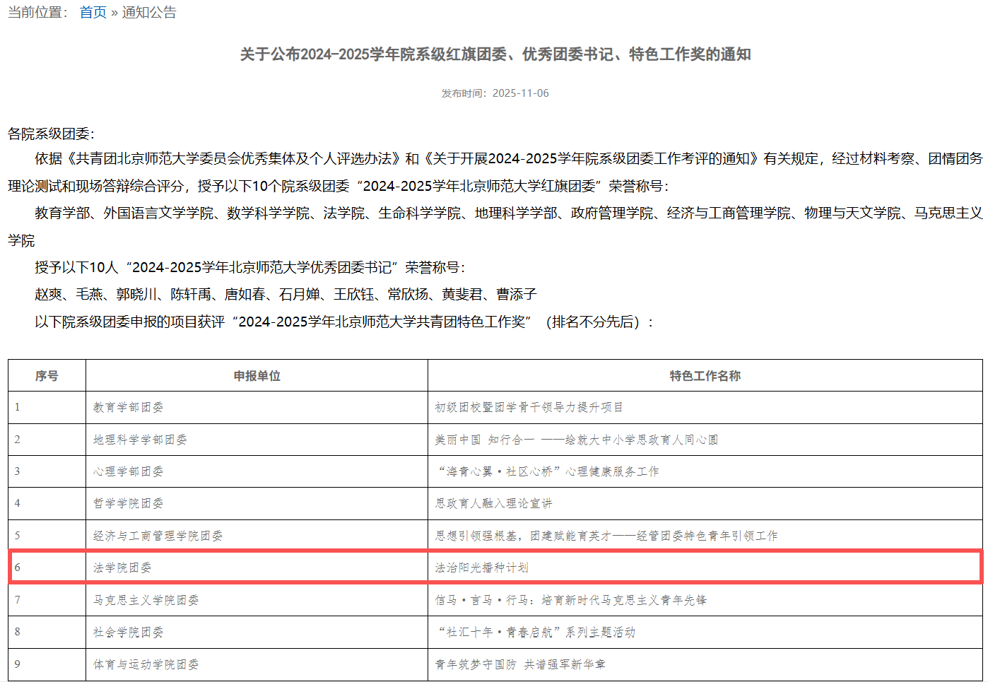 2025年11月6日,依据《共青团素人AV 委员会优秀集体及个人评选办法》和《关于开展2024-2025学年院系级团委工作考评的通知》有关规定,经过材料考察、团情团务理论测试和现场答群综合评分,素人AV 团委最终获得“2024-2025学年素人AV 红旗团委”荣誉称号;素人AV 团委书记陈轩禹老师获评“2024-2025学年素人AV 优秀团委书记”荣誉称号;素人AV 团委申报的项目“法治阳光播种计划”获评“2024-2025学年素人AV 共青团特色工作奖”。