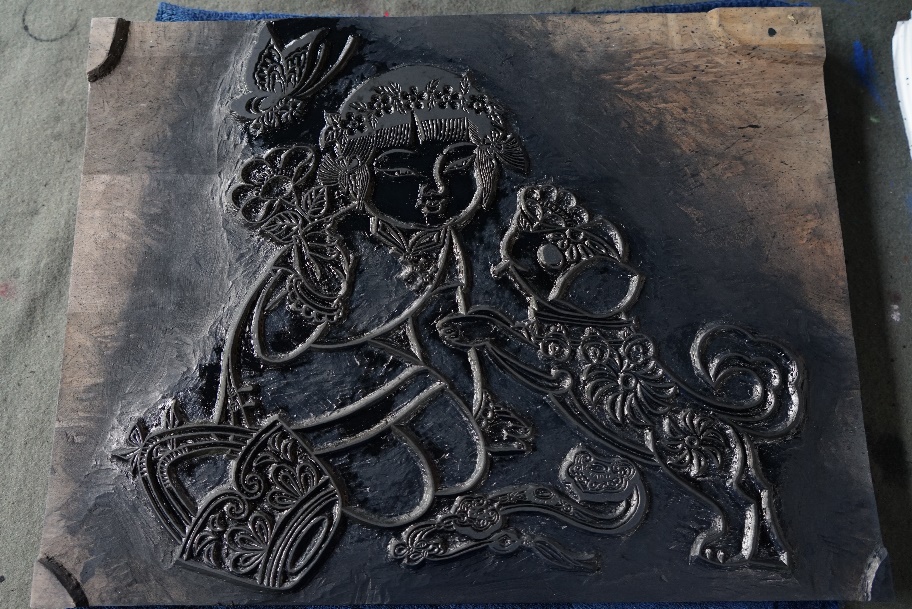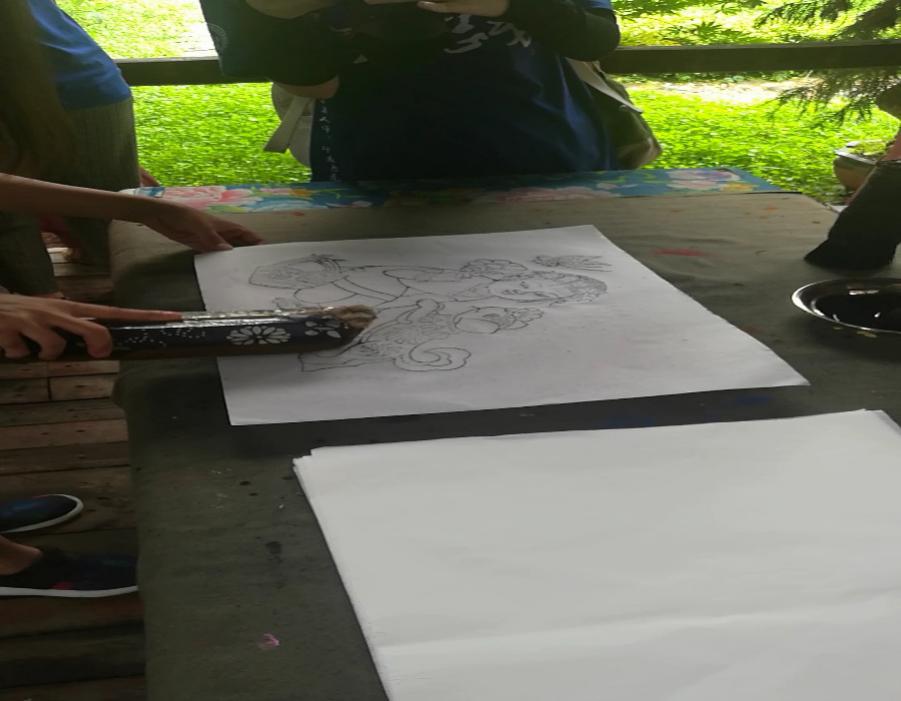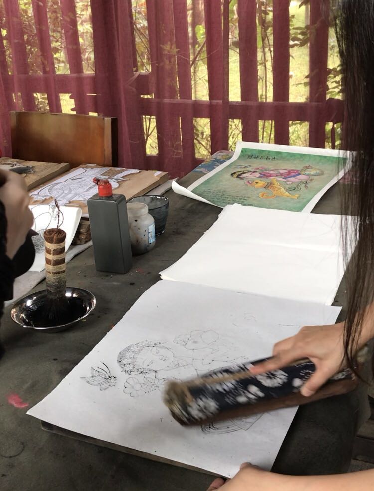 访谈结束后,实践队员们参观了画坊各色的功能区域,加深了对画坊的认识,并进行了一堂有趣的年画拓印课。贾君老师手把手的教队员们完成了一幅简单的年画的拓印环节,虽然是简单的一个环节,但里面的门道也不少,在这个过程中队员们更加体会到了传统工艺的精巧和细致。
