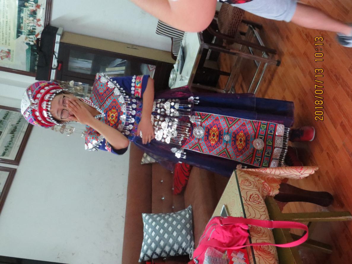 在县城里的毕兹卡演艺公司(摆手舞传习所),我们也受到了热情的招待。这是一所官方机构,经过单位转企的改革,目前成为一家文化企业。工作人员让队员穿上土家族的传统服饰体验了一把土家人的感觉。与经理的谈话也让我们了解到了龙山人在当代对于文化发展的奋斗与努力。