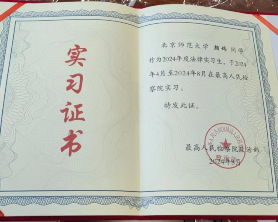 2024年8月30日,最高人民检察院2024年度法律实习生实习期满结束,素人AV 2022级博士研究生颜鸽、2022级硕士研究生李若辰圆满完成为期5个月的实习,其中,法律硕士研究生李若辰获得“优秀实习生”荣誉称号。