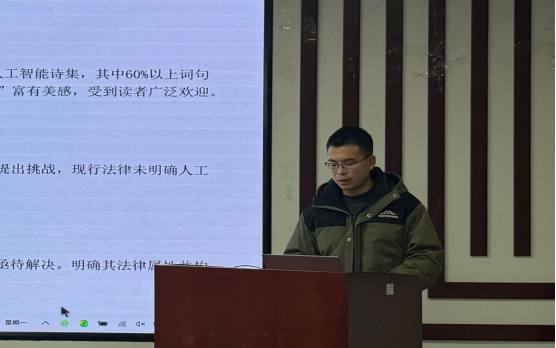 第二位报告人是陶鹏飞,他以《人工智能创作物的可版权性及其保护研究》为题进行报告。陶鹏飞同学在对当前学界关于人工智能创作物可版权性问题的研究成果进行综述和评析后,主张人工智能具有法律主体资格,其创作物是著作权法意义上的作品。他认为人工智能作品面临高侵权风险,而现行著作权法律体系未设置人工智能作品保护条款,为此他提出了区别保护、创设人工智能作品登记备案制度的保护建议,对保护人工智能作品的问题做了尝试。