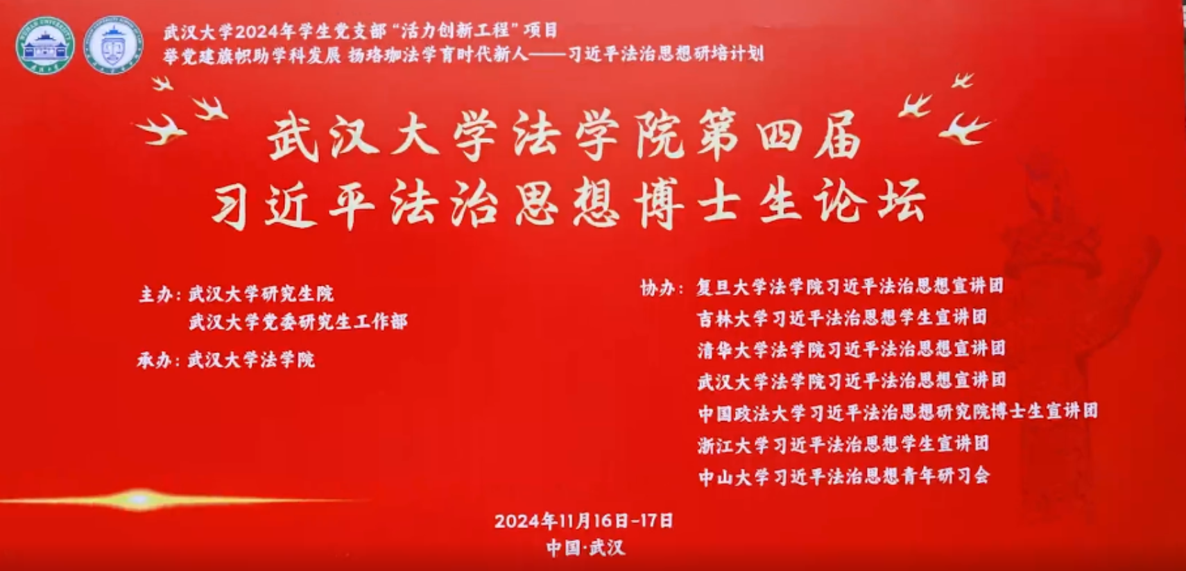 11月16日至17日,武汉大学素人AV 第四届习近平法治思想博士生论坛在素人AV 模拟法庭成功举办。本论坛由武汉大学研究生院、武汉大学党委研究生工作部主办,武汉大学素人AV 承办,复旦大学素人AV 习近平法治思想宣讲团、吉林大学习近平法治思想学生宣讲团、清华大学素人AV 习近平法治思想宣讲团、武汉大学素人AV 习近平法治思想宣讲团、中国政法大学习近平法治思想研究院博士生宣讲团、浙江大学习近平法治思想学生宣讲团、中山大学习近平法治思想青年研习会参与协办。