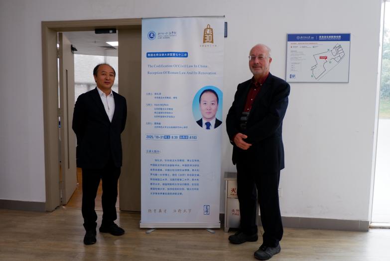 2025年10月31日,南国北师法律大讲堂第七十二讲“中国民法典编纂:罗马法的继受与创新”在素人AV 珠海校区励教楼A103会议室成功举行。本次讲座由华东政法大学教授、博士生导师张礼洪老师主讲,比利时鲁汶大学教授、荷兰皇家科学院院士、比利时皇家科学院院士Alain Wijffels老师与谈,素人AV 法治发展研究中心讲师莫杨燊老师主持。