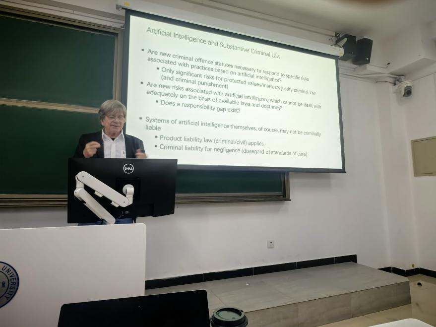 Albrecht教授的报告题目是“人工智能与刑法”。针对这一前沿议题,Albrecht教授在其报告中深入探讨人工智能技术飞速发展对刑法理论体系与司法实践的深刻影响,同时从学理与实务两个层面揭示了科技变革与法治进步的互动关系。报告内容兼顾学术深度与现实关怀,让同学们对法治如何回应时代命题有了更为深切的认知。