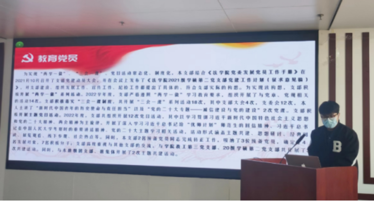 2021级博士生党支部书记侯撼岳介绍了党支部的基本情况,有针对性地提出,要开展多样化的活动、加强理论学习的专业化、精细度,加大支部活动宣传力度等改进方案。2021级学硕第一党支部书记张倩介绍了支部2022年度的主题教育、理论学习、规范化建设和党员培养情况。同时,规划通过每月举办读书会、党史知识竞赛、普法宣传等方式进一步提升工作质量。2021级学硕第二党支部书记孙鹏庆对上一年度支部党员教育、党员管理、党建宣传、党员发展情况展开介绍,并用感恩、感知、感奋三个关键词对年度工作做了总结。2021级法律硕士第一支部书记孔奕博提出未来一年将重点围绕创建支部特色品牌活动、提升党员积极性、凝聚师生共识开展工作。2021级法律硕士第二支部书记周万朔介绍了2022年党支部的特色与创新工作,如打造精品党日,跨校开展支部共建;通过党课深化理论学习;抓牢宣传阵地,紧跟时代潮流等。本科生第一支部书记张佳璇结合冬奥志愿活动、学习党的二十大精神以及120周年校庆介绍了支部组织建设和主题教育活动开展情况。