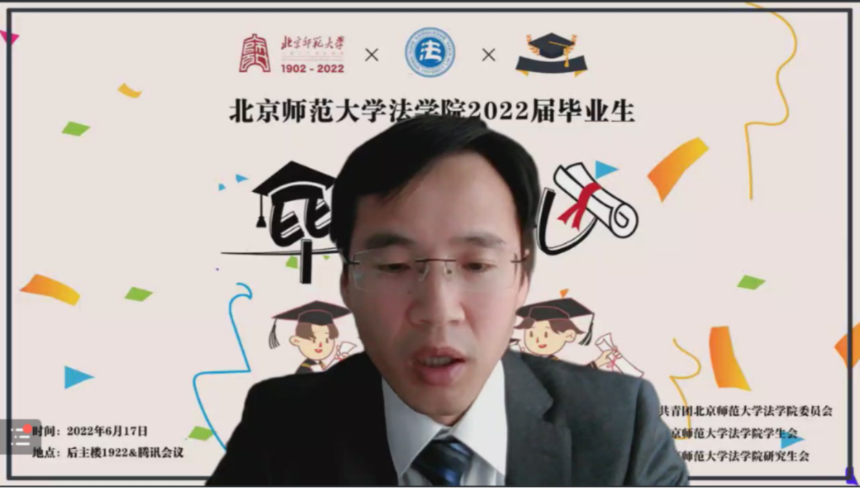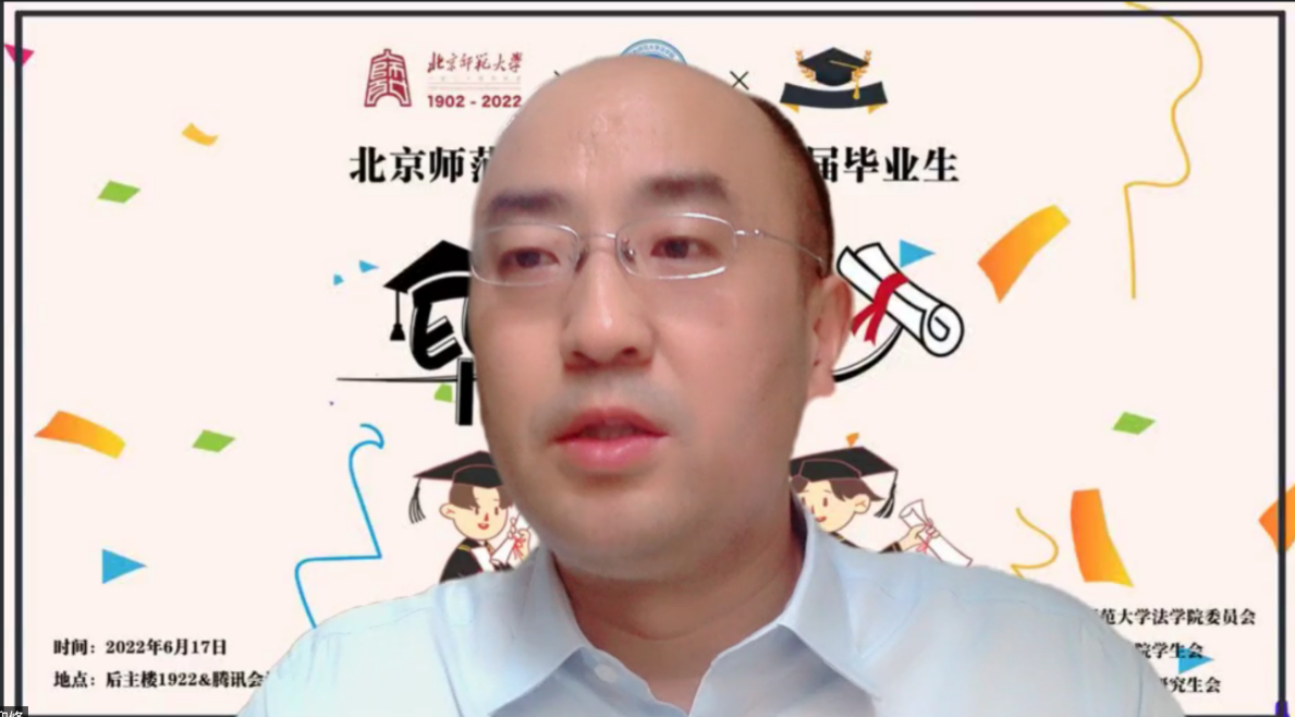 劳佳琦副教授首先热烈祝贺同学们通过自己的努力和对导师们的折磨顺利拿到了学位,然后与同学们分享了自己在监狱调研时的人生感悟:第一,人生应该有底线思维,作为法律人,更要以法律来约束自己,时刻保持对法律红线与道德准则的敬畏;第二,尽管我们无法消灭欲望,但是一定要警惕和管理自己的欲望,不要被欲望奴役和吞噬,更不要被他人左右自己的欲望;第三,人生实难,唯有勇敢面对,至暗时刻,人一定要有拔着自己的头发,把自己从泥潭里面拉出来的勇气和狠劲。最后,她祝愿同学们能够打拼出一个美好的人生,创造出一个更好的世界。