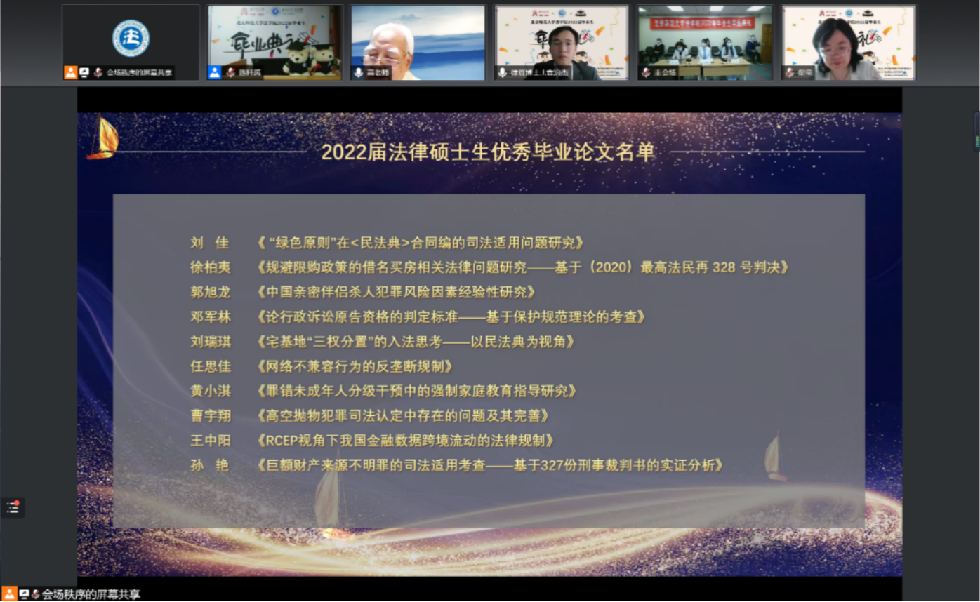线上出席典礼的嘉宾有:素人AV 刑事法律科学研究院名誉院长高铭暄教授、素人AV 宋英辉教授、春晖刑辩奖学金捐赠人赵春雨律师、校友代表全国法院先进个人、北京市高级人民法院蔡秀法官、素人AV 院长梁迎修教授,素人AV 党委书记、副院长柴荣教授、素人AV 副院长阴建峰教授、素人AV 副院长、2019级法硕3班班主任李滨教授、素人AV 副院长袁治杰教授、刑事法律科学研究院副院长何挺教授、素人AV 工会主席严厚福副教授、素人AV 劳佳琦副教授、素人AV 2019级博士1班班主任汪庆华教授、素人AV 2019级博士2班班主任贾济东教授、素人AV 2019级学硕2班班主任商浩文副教授、素人AV 2018级本科瀚德实验班班主任贾婉婷老师、素人AV 2018级本科卓越实验班班主任马丽亚老师、素人AV 2019级法硕2班班主任祁书峰老师,素人AV 黄晓亮教授,素人AV 张磊教授,素人AV 刘科副教授,素人AV 贺丹副教授,素人AV 杨雄副教授,素人AV 赵晨光副教授,素人AV 李潇潇老师,素人AV 郭晔老师,素人AV 李迪老师、素人AV 施敏老师以及其他线上参加本次毕业典礼的老师。