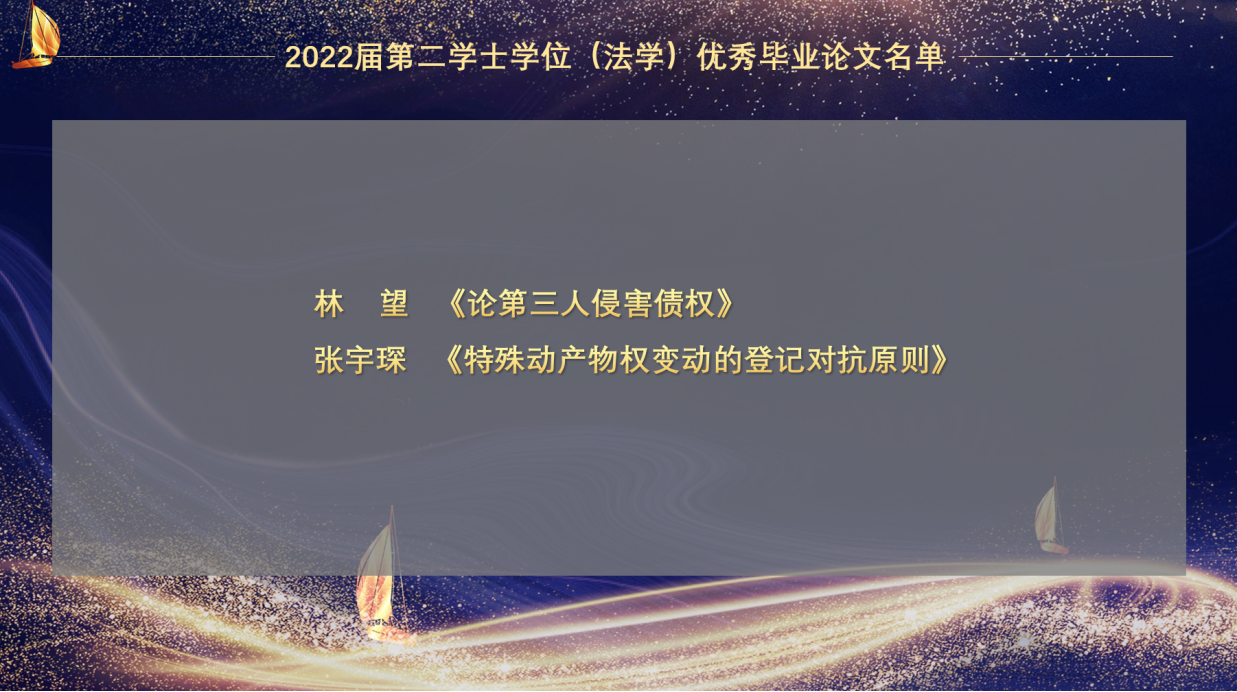 袁治杰教授宣读了2022届本科生优秀毕业论文及第二学士学位(法学)优秀毕业论文获奖名单,并祝全体毕业生同学们乘风破浪十万里,直上云天揽日月。(滑动查看具体名单)
