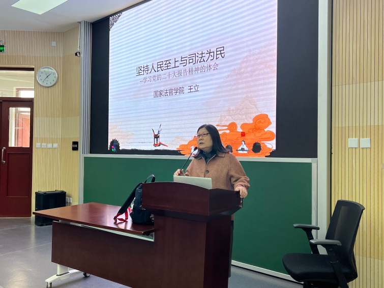 王立教授回顾梳理了中国共产党成立以来人民司法组织的历史演变。从“人民法院”这一称谓入手,细致阐释了我国人民法院的性质。为同学们呈现了我国人民司法制度的流变:作为“延安五老”之一的谢觉哉同志提出切实改变办案质量不高的问题,恢复法院正常审判制度;董必武同志提出“有法可依、有法必依”;何叔衡同志提出“以事实为依据,以法律为准绳”;梁柏台同志是依法执政、依法治国的先驱。王立教授指出司法为民是中国共产党初心使命在司法工作中的具体体现。