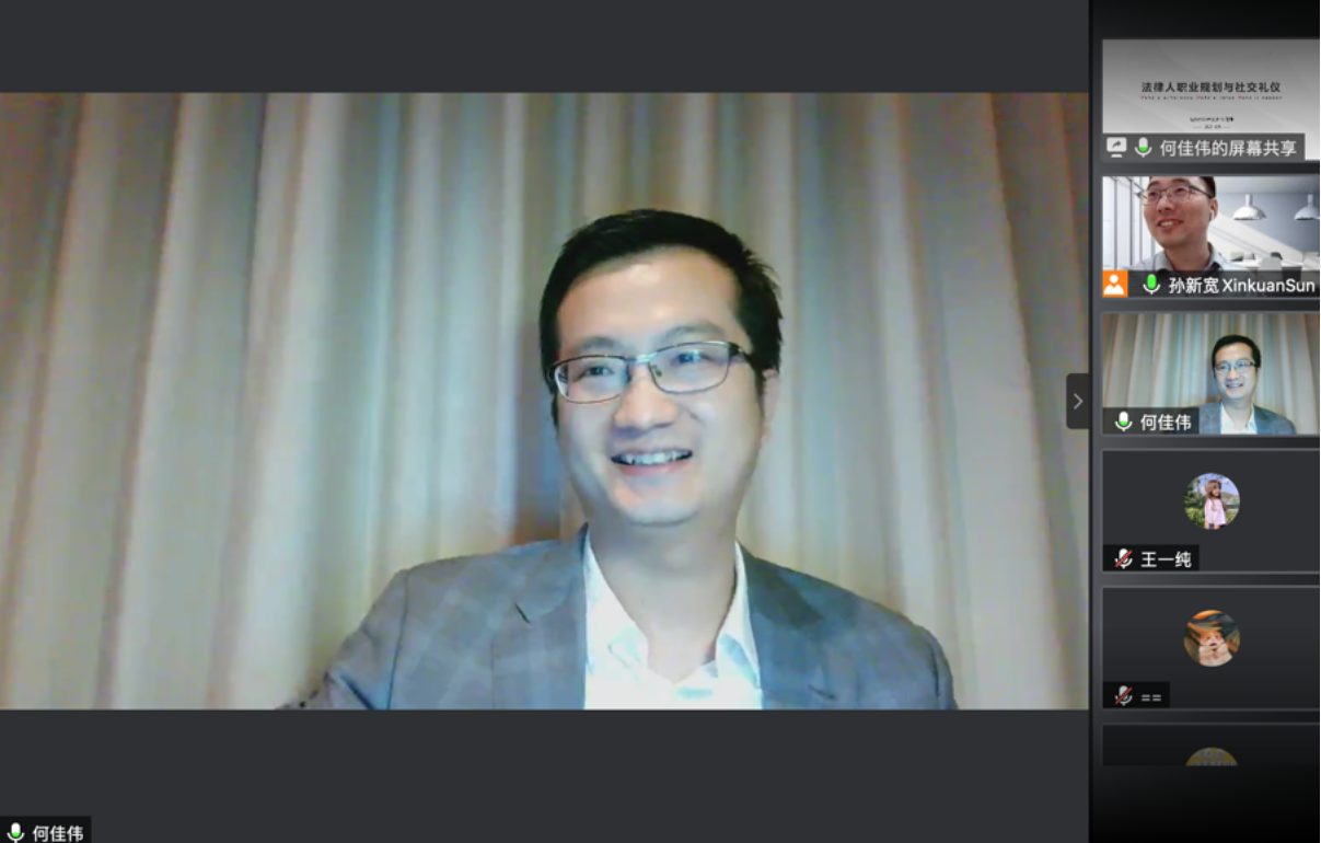 2021年9月16日晚,京师法学大讲堂第二十讲——“法律人社交礼仪与职业规划”于线上顺利举行。在学院的大力支持下,本次讲座邀请到了植德律师事务所战略合伙人何佳伟律师,为同学们分享作为法律人应如何进行职业规划以及在人际交往中的基本礼仪等相关内容。本次讲座同时也是素人AV 法律硕士教育与管理中心为2021级新同学举办的新生入学教育活动中的一讲。讲座由素人AV 孙新宽老师主持。素人AV 本科生及硕士生共计260余名同学参与了本次讲座。