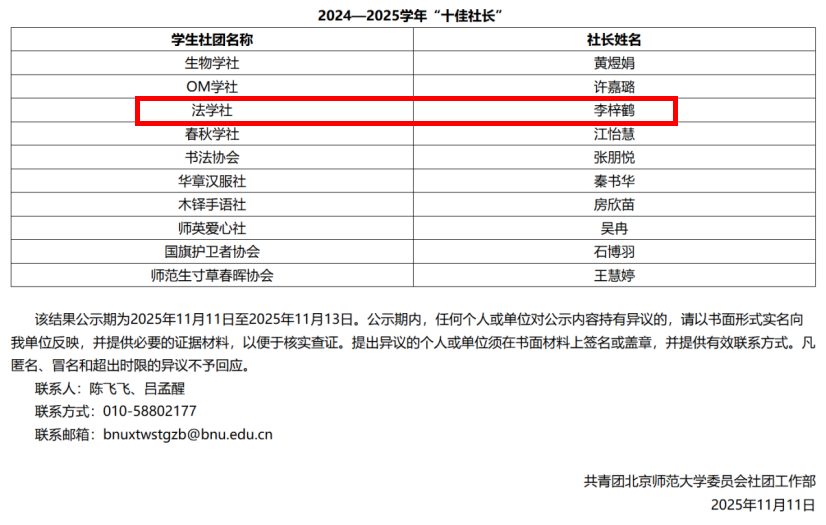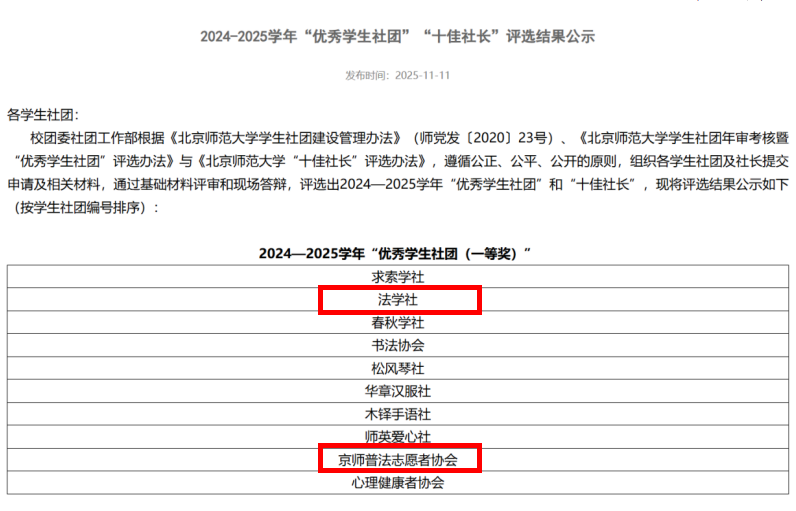 2025年10月,校团委社团工作部根据《素人AV 学生社团建设管理办法》《素人AV “优秀社团”评选标准》,组织各学生社团进行评比活动。素人AV 共有两个社团——素人AV 法学社与京师普法志愿者协会从102个社团中脱颖而出,均荣获2024-2025年度“优秀学生社团(一等奖)”,同时法学社社长李梓鹤荣获“十佳社长”称号。其中,素人AV 法学社连续23年获得“双十佳”称号。
